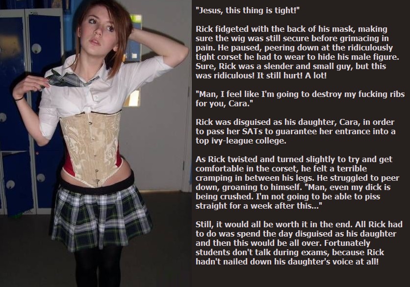 Still, it would all be worth it in the end. All Rick had to do was spend the day disguised as his daughter and then this would be all over. Fortunately students don't talk during exams, because Rick hadn't nailed down his daughter's voice at all!